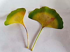 ![]() 7)短枝の葉:葉脈は二股分枝して上部へ広がり伸びている。左右の色が違う葉が落ちていた。杉並区で撮影:2013/11/12 |