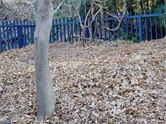 | 3-2)落葉が腐葉土に: 約一年後、上段の★3-6の落葉は/1/3程度の量になり、真っ黒な腐葉土になった。場所:善福寺公園 この落葉溜は同じ時期、同じプロセスで数年間使われた。 |