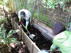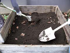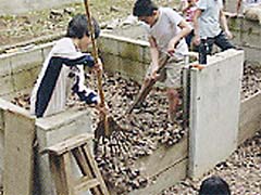 ![]() ★2.【腐葉土作り-1】:街路樹の落葉+水(落葉を入れ>>踏む>>水を入落葉を入れを繰返し、箱一杯に落葉を詰める。一年後、落葉は半分の量の腐葉土に変身。撮影:エコガーデン・2009/11/10 |