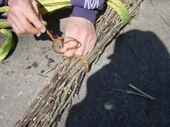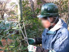 ![]() 5.【足を使って畳縁のひもで枝を締め、次に枝元をシュロ縄で縛り、次にその先を同様に】。撮影:善福寺公園・2006/03/14 |