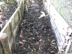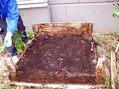 ![]() ★3.【腐葉土作り-2】:毎年作っていたが、箱が腐り始めたので、この日に最後の腐葉土を取り出し、板は処分した。撮影:エコガーデン・2012/03/06 |