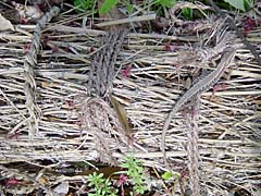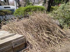 ![]() 4.【上段3の畳縁のひもの上に同一方向に剪定枝を並べる】。撮影:善福寺公園・2006/03/14 |