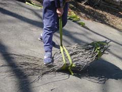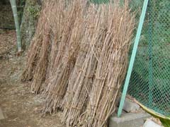 ![]() ★7.【外で作業をする会員】竹の幹を2m長さに切断。竹枝を一方向に束ねて、畳の縁紐で束ねる。 |