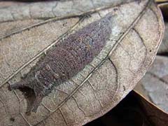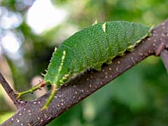 ![]() 2.ゴマダラチョウの幼虫:春、枯葉から出てエノキの枝に登り、体表をエノキの葉の色と同じ緑色に変える。撮影:善福寺公園 |