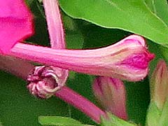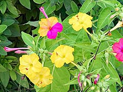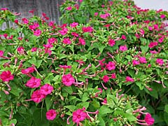 | 【季語】白粉花>おしろい。*1:P676。「熱帯アメリカ原産...小型の花は良い香りで、夕方から開き翌朝しぼむ」。繁殖力があり、身近で見られる晩夏~初秋の草花で、様々な色の園芸品がある。 【色水屋さんごっこ】遠い日の小学校の夏休みの遊びに「色水屋さんごっこ」がありました。懐かしい思い出です。アサガオやオシロイバナの咲き終わった花殻を集め、空き瓶などに水と共に入れてよく揉(も)んで色水を作ります。色違いの水を瓶に入れて並べ、色水を売る人・買う人に分かれて遊びました。  |