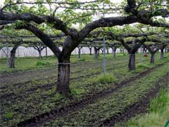 | 【季語】梨、 *1:植物:P648。「バラ科の落葉高木の果実で、果汁に富む」。 【ノート-1】梨の樹形:昔、小田急線稲城駅近くの梨園を訪問しました。木は作業しやすい高さに保つ棚があり、枝が四方へ広げた独特の樹形でした(★下借用画像1を参照)。 【ノート-2】子供の頃の梨:「赤梨系」では「長十郎」と、「青梨系」では「二十世紀」と呼ばれる二種類だけでした。今は大きく、甘い様々な品種が出回っています。  |