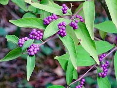 ![]() 5. コムラサキの果実:左字をクリックすると本HPのムラサキシキブへジャンプ。熱帯アメリカ原産。撮影:杉並区北西部・2025/09/30 |